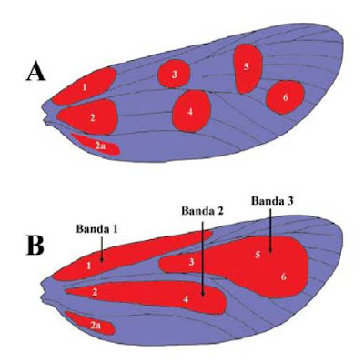 Denominación de los puntos (A) y bandas (B) del ala anterior en Zygaena